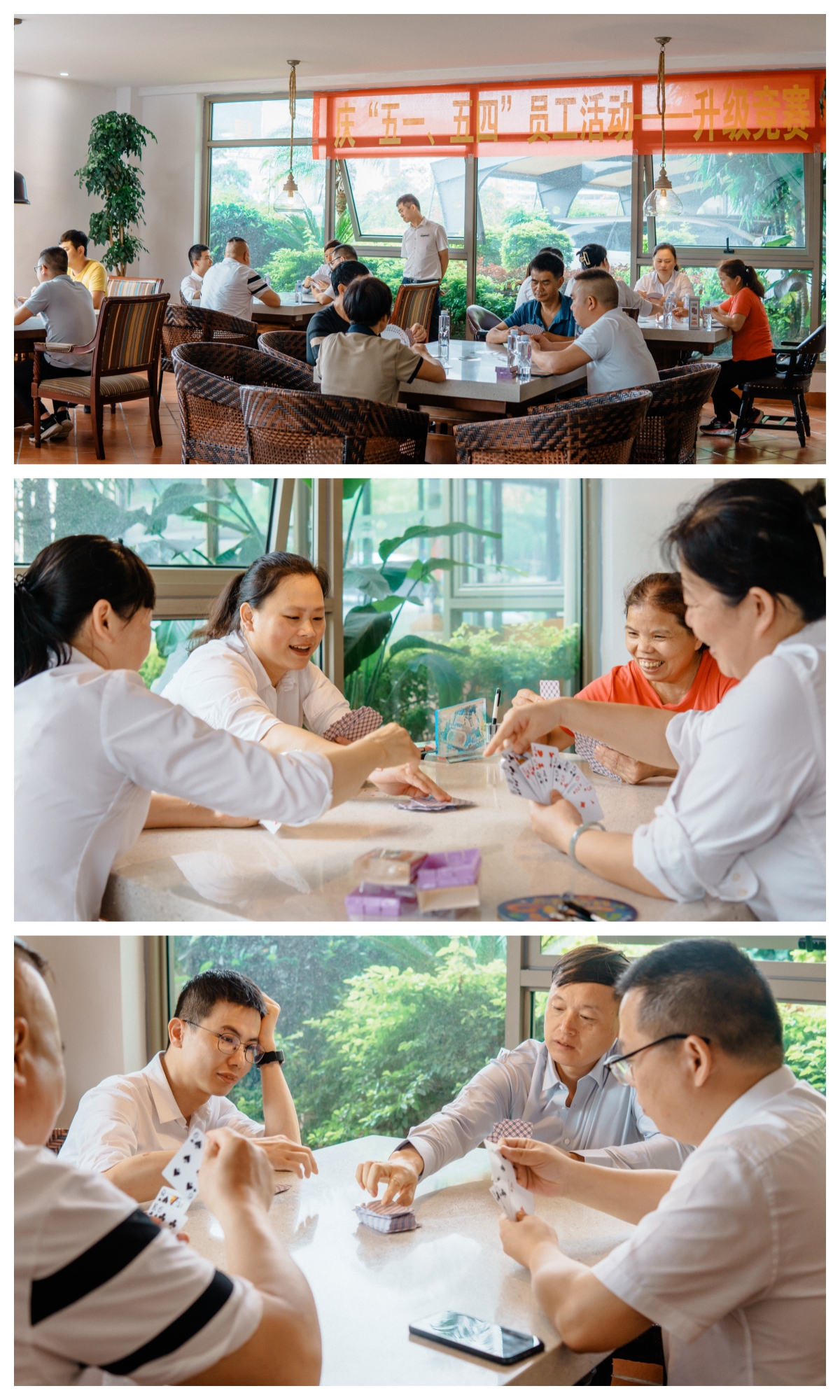 激烈緊張的拔河比賽之外,本次活動還設了“軟實力”協作配合為主的升級競賽項目(80分)。 來自各單位的8組參賽隊伍抽簽決定PK比賽隊伍,按撲克牌升級游戲規則實行單輪淘汰賽,經過首輪角逐,共晉級出4支隊伍進入冠、亞、季軍決賽圈。 進入決賽圈的4支隊伍面對更具挑戰性的對手,絲毫不敢懈怠,現場氣氛緊張感十足,經過激烈的交鋒,華僑大酒店潘淑琴、黃欣瑜獲升級競賽冠軍;海西物流事業部黃泉德、陳唐祥獲升級競賽亞軍;南安大酒店李水祥、謝乙凡獲升級競賽季軍。
