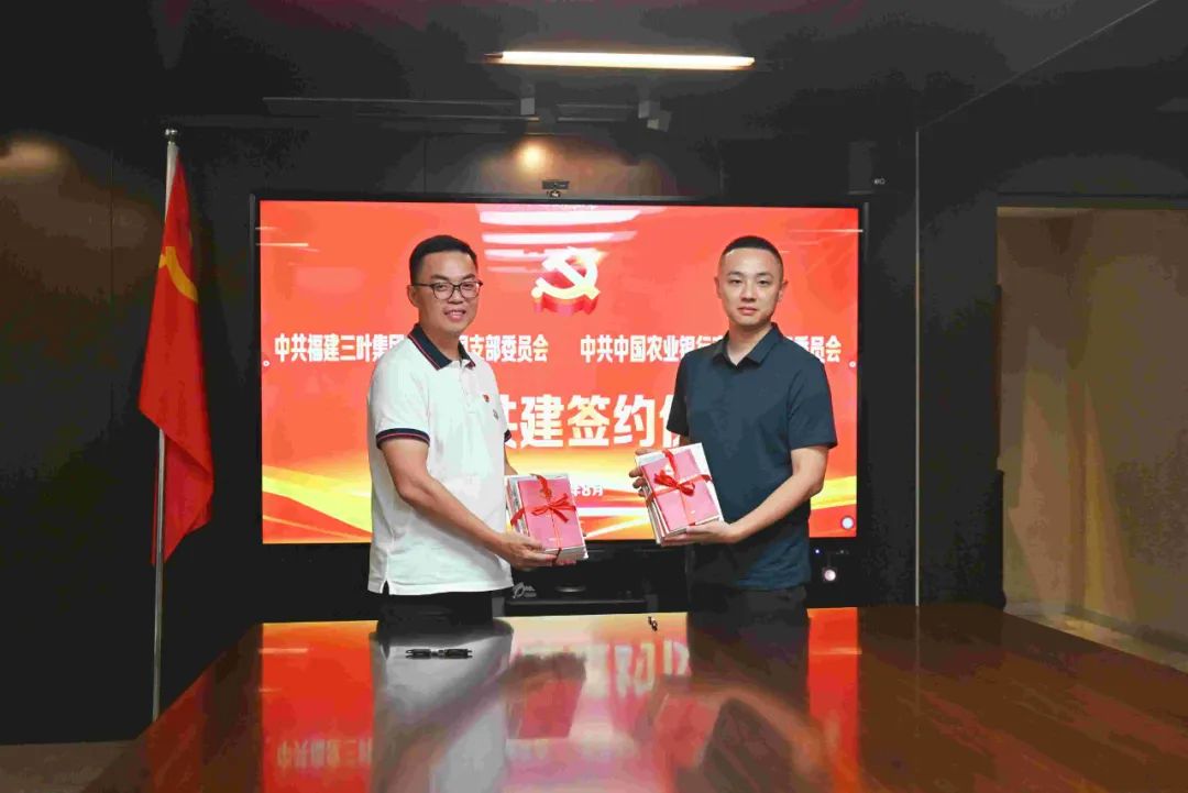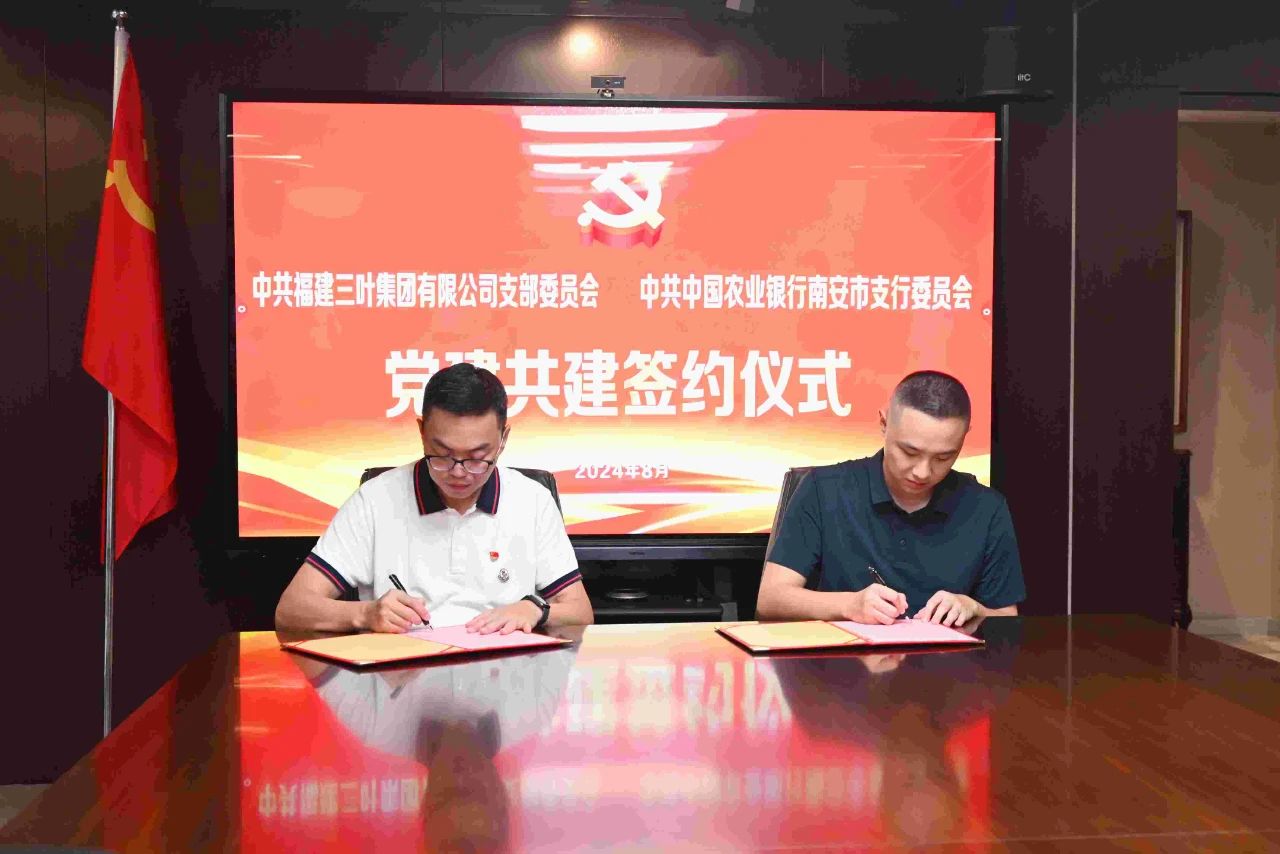 中共福建三葉集團支部聯手中共中國農業(yè)銀行南安市支行委員會開展黨建共建活動作者: 來源: 時間:2024-8-20 18:00:00 8月20日,中國農業(yè)銀行南安市支行與福建三葉集團舉行黨建共建簽約儀式。雙方按照“優(yōu)勢互補、共聯共建、互帶互動、共謀發(fā)展”原則,充分發(fā)揮雙方資源優(yōu)勢,共同推動組織共駐共建、黨員共管共育、資源共幫共享,為雙方推進黨建創(chuàng)新、鄉(xiāng)村振興和實現合作共贏注入新的活力。中國農業(yè)銀行南安市支行黨委書記、行長高輝雄、三葉集團總裁葉喬鈞、支部書記李炳聰等出席簽約儀式。