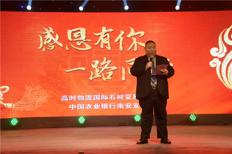 “感恩有你·一路同行”高時物流國際石材交易中心客戶聯誼會圓滿落幕作者: 來源:高時物流 時間:2015-2-26 16:12:57 1月23日“感恩有你·一路同行”晚會在高時物流國際石材交易中心新建3期大板市場內璀璨啟幕,500多家商戶朋友受邀出席了此次活動。晚會過程中包含最佳合作伙伴頒獎儀式、抽獎環節、表演環節,環環相扣,振奮人心!