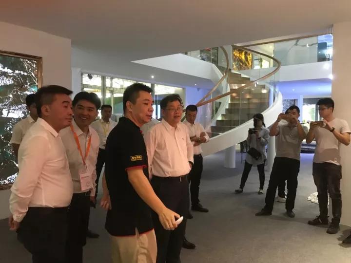 福建省經濟和信息化委員會副主任郭學軍,中共南安市委書記王春金,南安市市長林榮忠,南安市常務副市長黃輝燦,南安市常委紀委書記李巖華,南安市人民政府副市長陳洪春,水頭鎮黨委書記柯曉輝,水頭鎮人民政府鎮長蔡清安,南安市經濟和信息化委員會主任林良泉,泉州市石材工業協會會長王尚云,南安市石材工業協會會長王清安等領導在海西物流股份有限公司副總經理陳少健等人陪同下,參觀了海西國際石材荒料展,并詳細詢問了參展荒料的產地、質地。隨后,還參觀了海西石材城奢石館,在美好石代展館里,王春金表示,石材與光電的結合,更加充分地展現了石材背景墻的光澤度、色澤度,這種石材創新模式是值得肯定的。